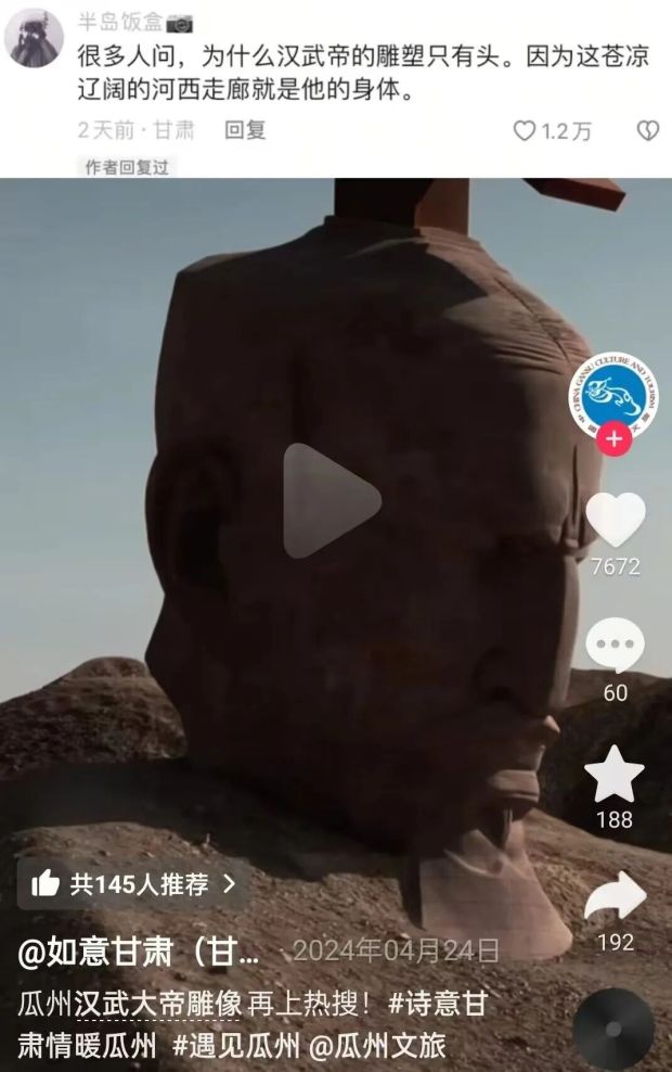 但是雕像2020年落成,2024年甘肃文旅曾经发布对雕像的宣传,当时人们也问为什么只有汉武帝的头,没有他的身体,解释是:整个辽阔的河西走廊就是开疆拓土帝王汉武帝的身躯。那一解释当时获得大量点赞。