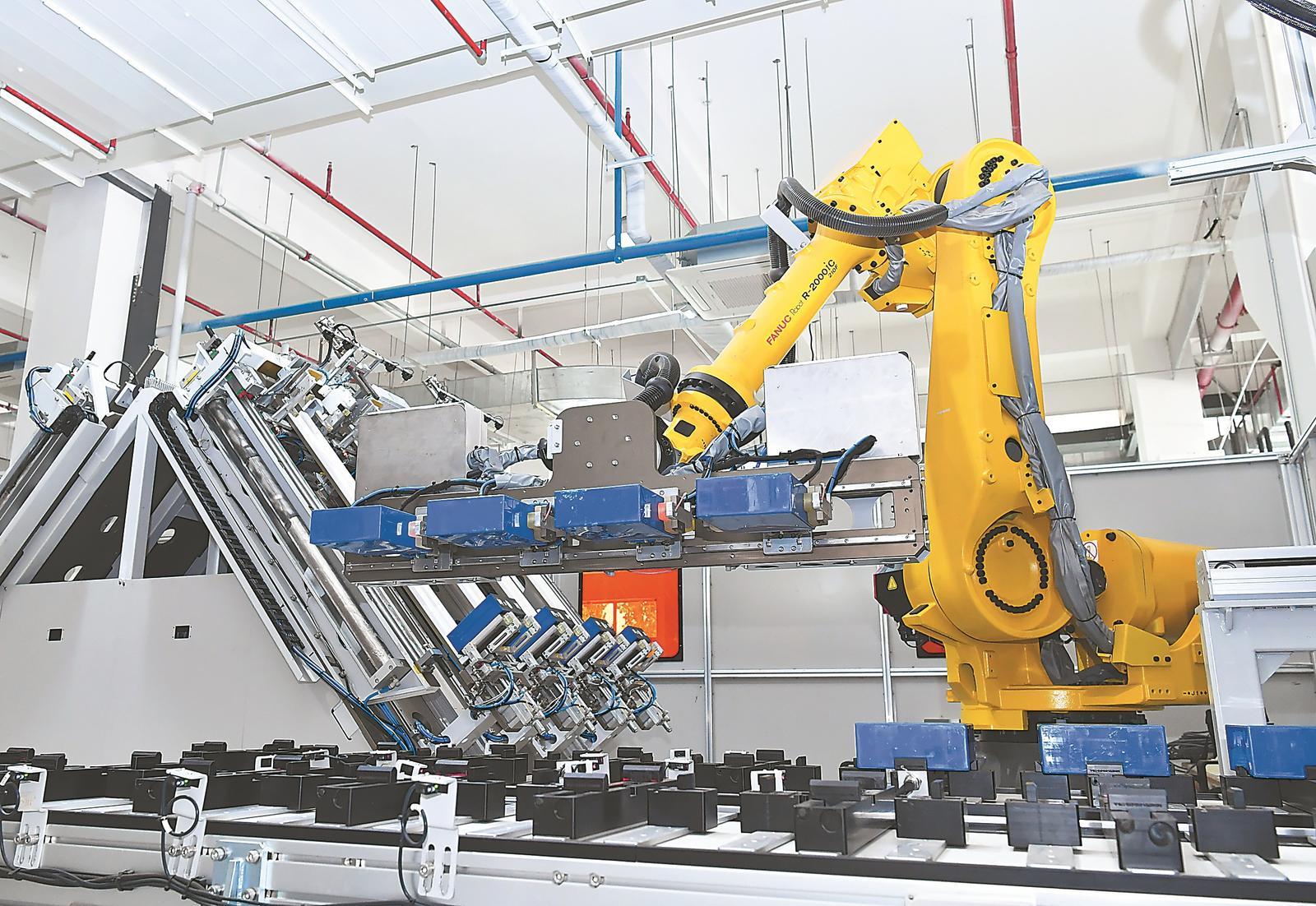 金派克新能源科技(淮北)有限公司动力电池生产车间,机器人在安装电池模组。记者程兆摄
