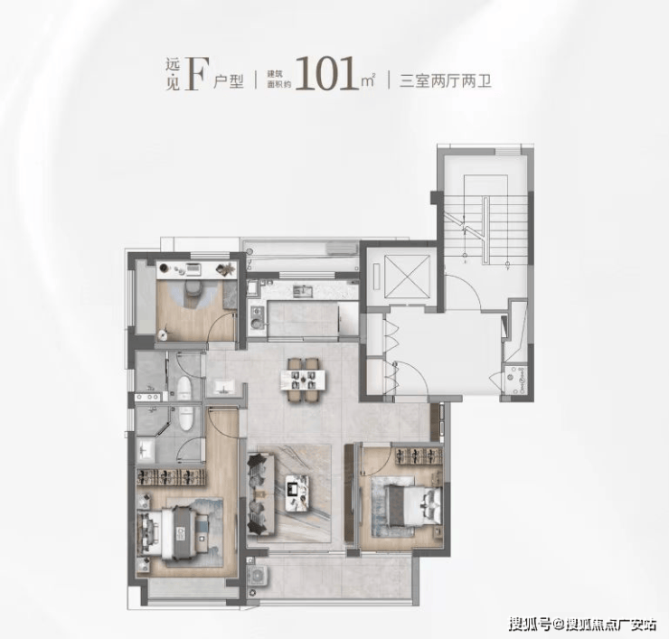 同样是3房2卫的配置,功能性与舒适度兼具。该户型惊艳的地方在于大尺度的景观边厅设计,搭配超大阳台,营造IMAX级别的客厅景观面,极具阔绰感!